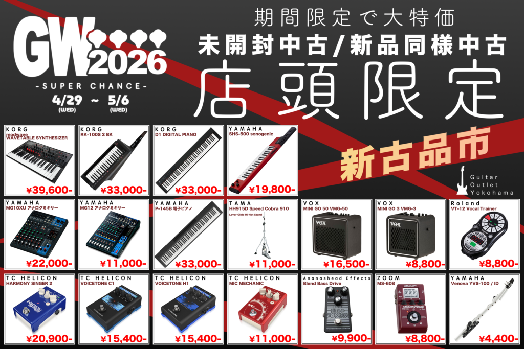 4/29(水)~5/6(水)の期間の間、Guitar Outlet Yokohama(GOY)にてゴールデンウィークイベントを開催します。 店頭限定目玉品は未開封中古/新品同様中古品を中心としたラインナップです。 開催期…