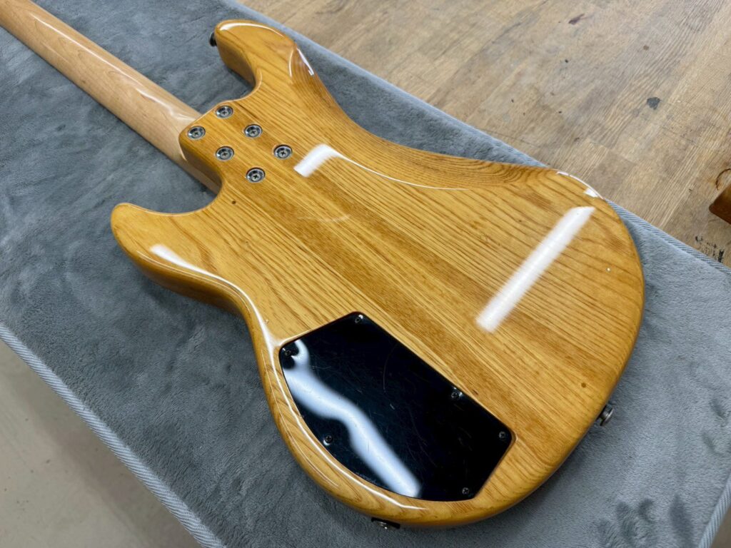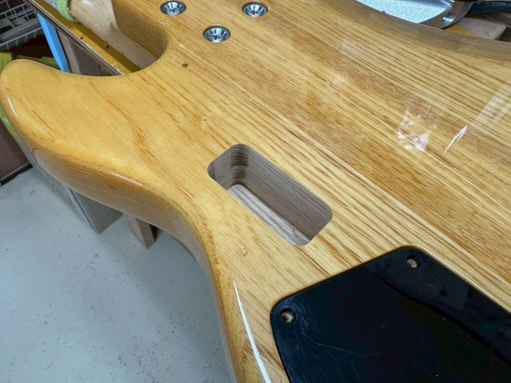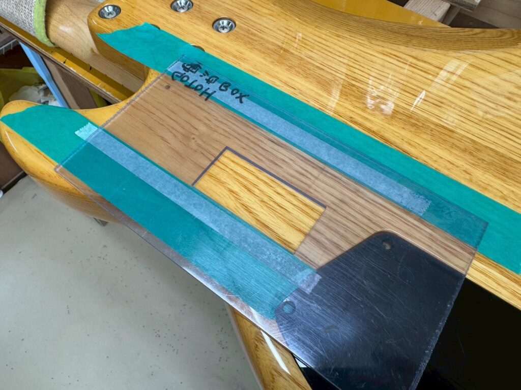 バッテリーボックスはどこにでも設置できる訳ではなく、ブリッジやピックアップと干渉しないところに設置する必要があります。今回は過去のリペア記事も参照しながら納得いただける場所に取り付けました。