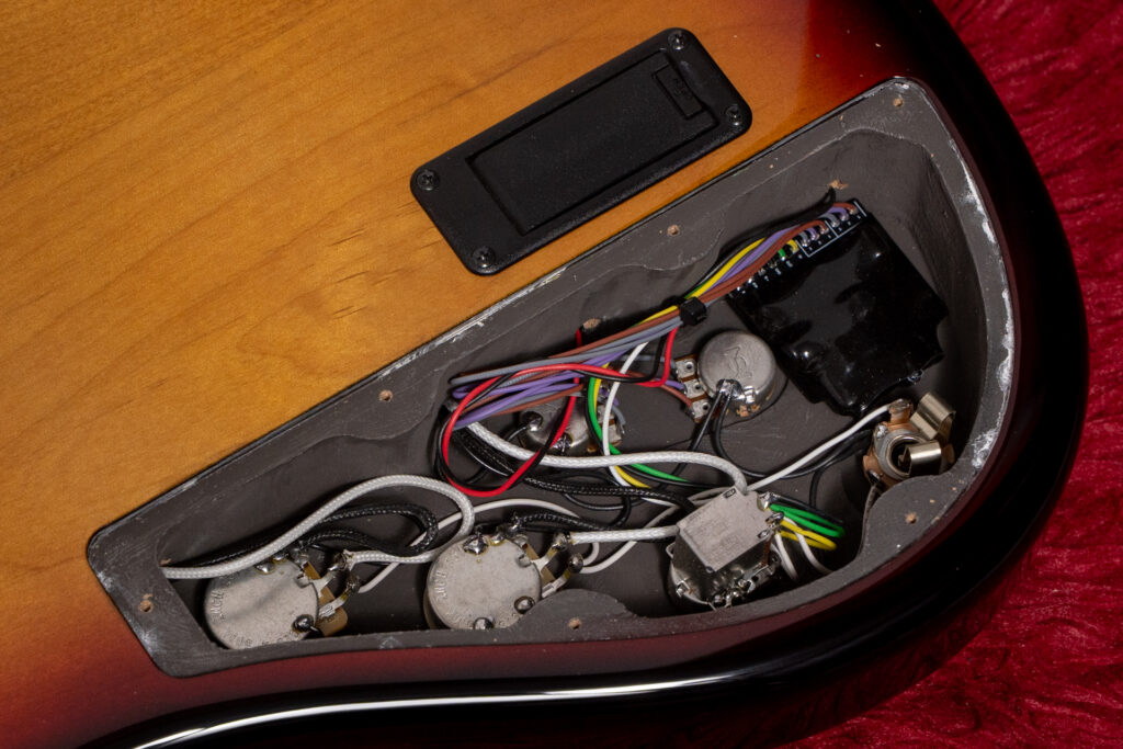 ピックガードはありませんが、ボディトップと弦のスペースは一般的なJBのピックガードと弦のスペースとほぼ同様に設定しました。